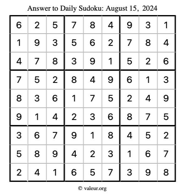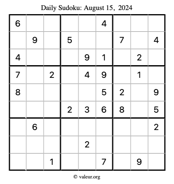 Here is the August 15, 2024 sudoku puzzle. You are welcome to print a copy to solve by hand. For your convenience, we have also included the solution further down the page so you can check your work.