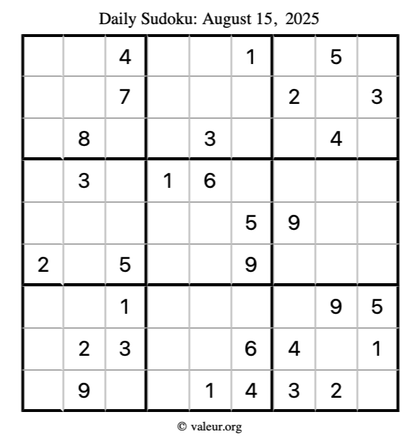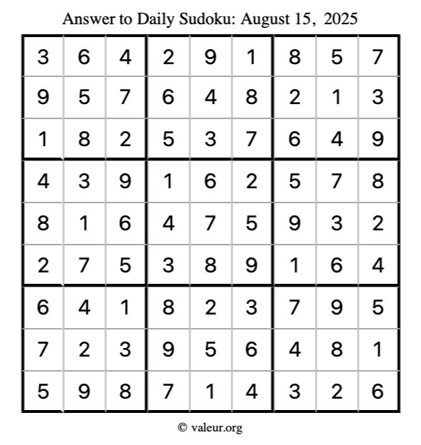 Here is the August 15, 2025 sudoku puzzle. You are welcome to print a copy to solve by hand. For your convenience, we have also included the solution further down the page so you can check your work.