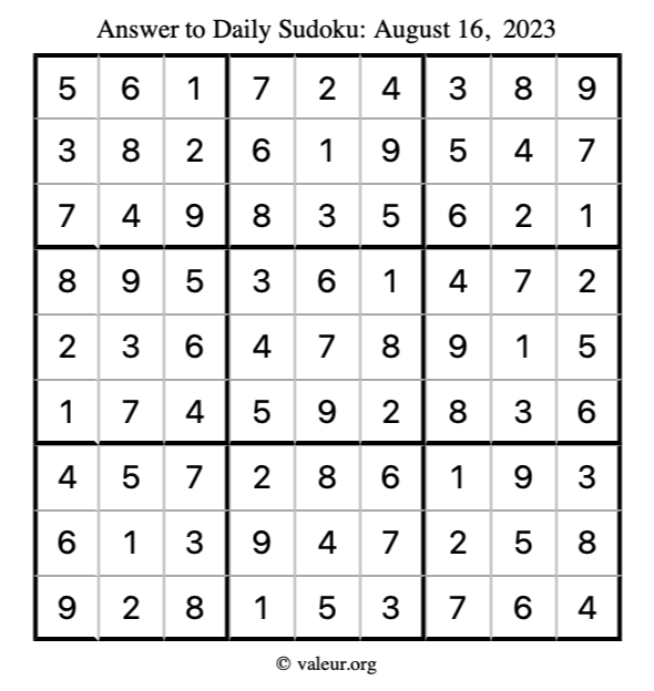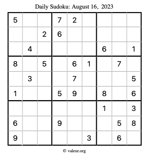 Here is the August 16, 2023 sudoku puzzle. You are welcome to print a copy to solve by hand. For your convenience, we have also included the solution further down the page so you can check your work.