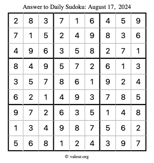 Here is the August 17, 2024 sudoku puzzle. You are welcome to print a copy to solve by hand. For your convenience, we have also included the solution further down the page so you can check your work.