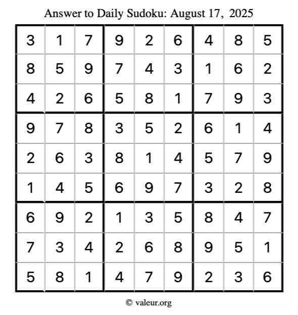 Here is the August 17, 2025 sudoku puzzle. You are welcome to print a copy to solve by hand. For your convenience, we have also included the solution further down the page so you can check your work.