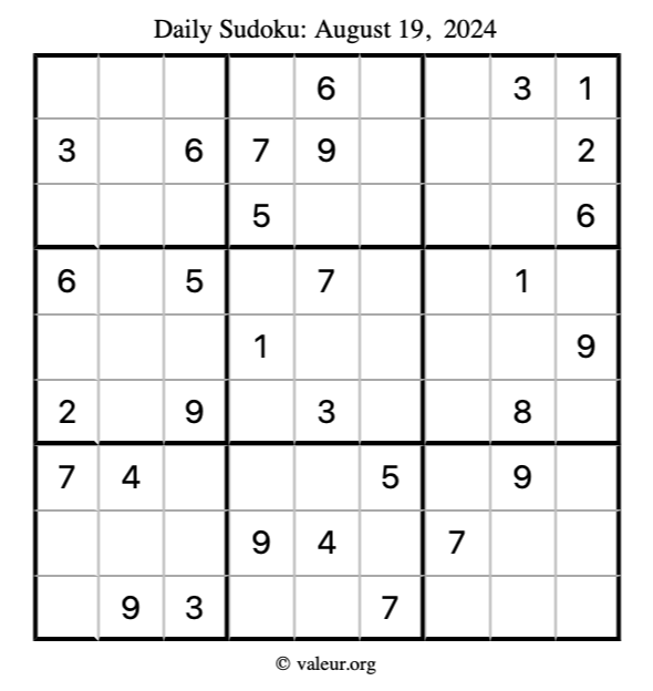 Here is the August 19, 2024 sudoku puzzle. You are welcome to print a copy to solve by hand. For your convenience, we have also included the solution further down the page so you can check your work.