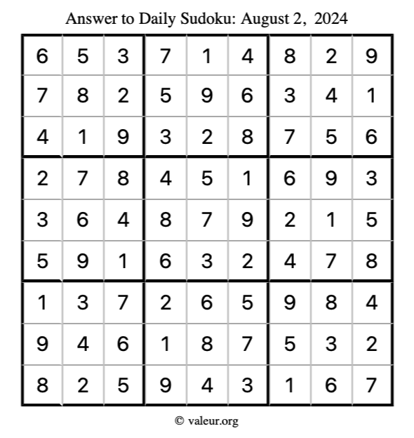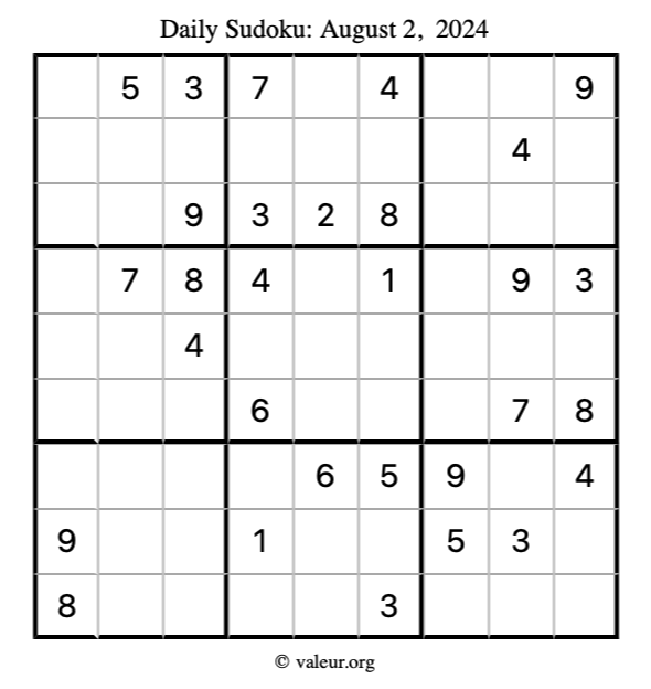 Here is the August 2, 2024 sudoku puzzle. You are welcome to print a copy to solve by hand. For your convenience, we have also included the solution further down the page so you can check your work.