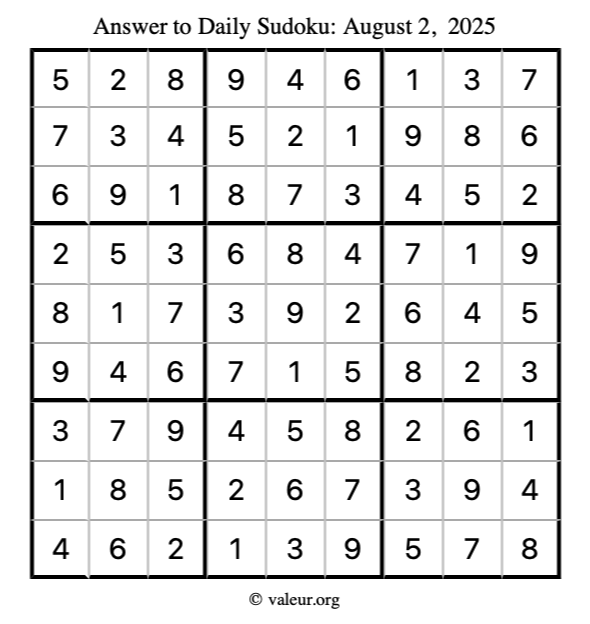 Here is the August 2, 2025 sudoku puzzle. You are welcome to print a copy to solve by hand. For your convenience, we have also included the solution further down the page so you can check your work.