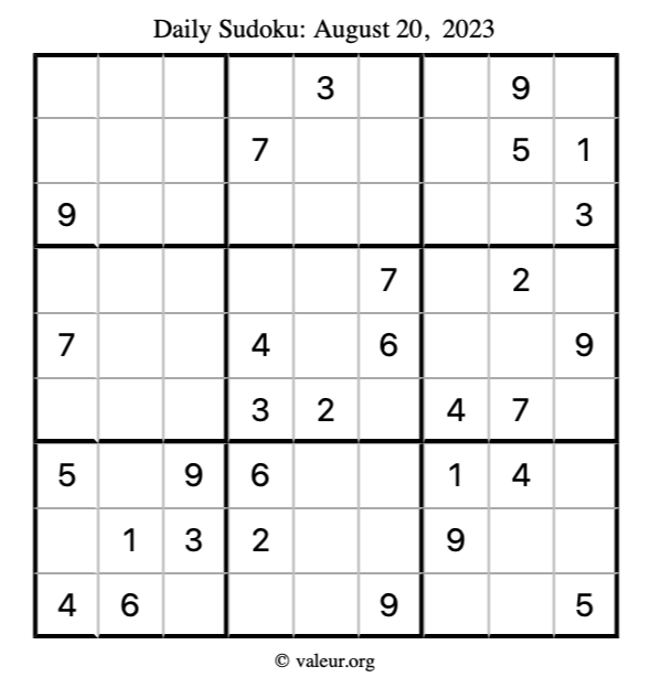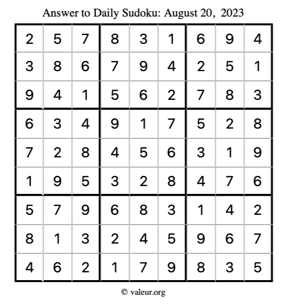 Here is the August 20, 2023 sudoku puzzle. You are welcome to print a copy to solve by hand. For your convenience, we have also included the solution further down the page so you can check your work.