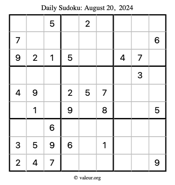 Here is the August 20, 2024 sudoku puzzle. You are welcome to print a copy to solve by hand. For your convenience, we have also included the solution further down the page so you can check your work.