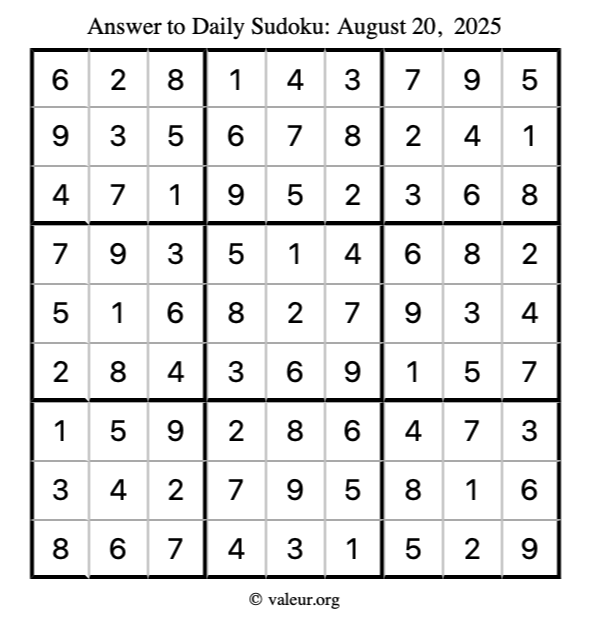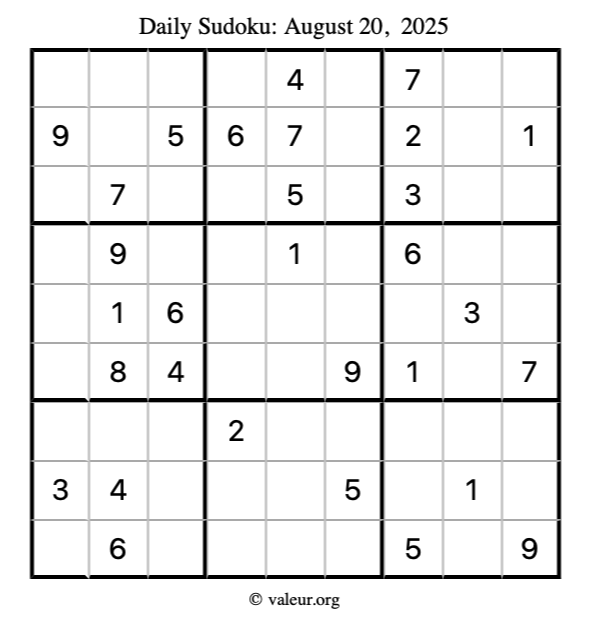 Here is the August 20, 2025 sudoku puzzle. You are welcome to print a copy to solve by hand. For your convenience, we have also included the solution further down the page so you can check your work.