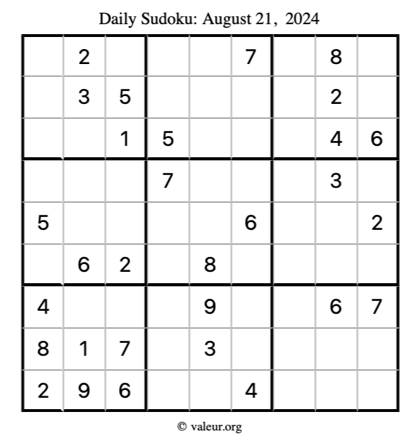 Here is the August 21, 2024 sudoku puzzle. You are welcome to print a copy to solve by hand. For your convenience, we have also included the solution further down the page so you can check your work.