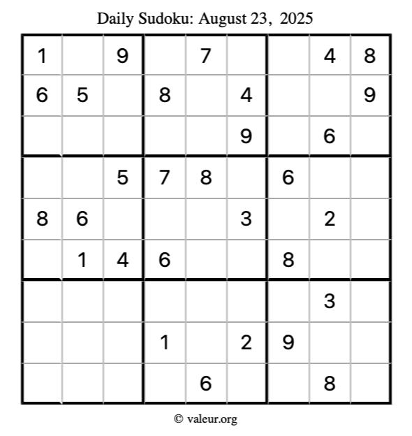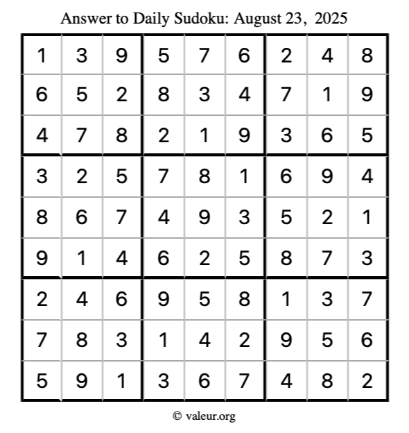 Here is the August 23, 2025 sudoku puzzle. You are welcome to print a copy to solve by hand. For your convenience, we have also included the solution further down the page so you can check your work.