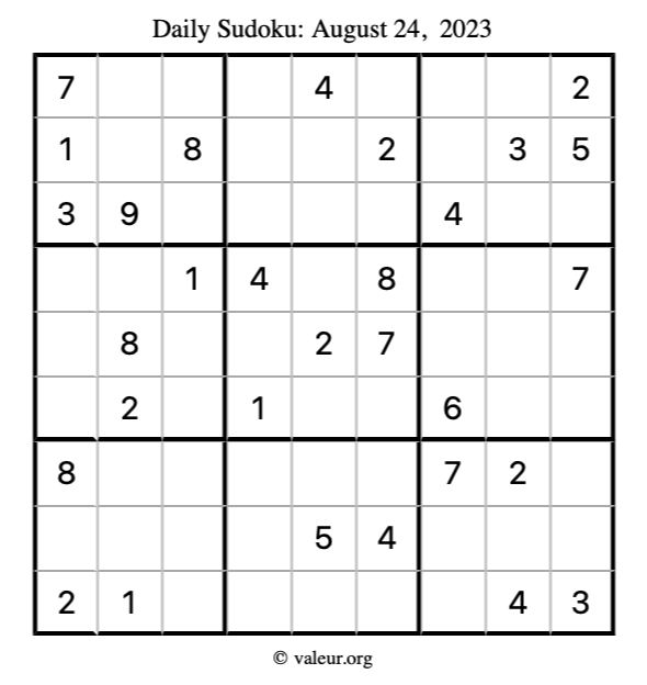 Here is the August 24, 2023 sudoku puzzle. You are welcome to print a copy to solve by hand. For your convenience, we have also included the solution further down the page so you can check your work.