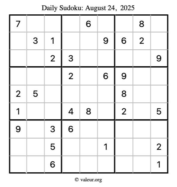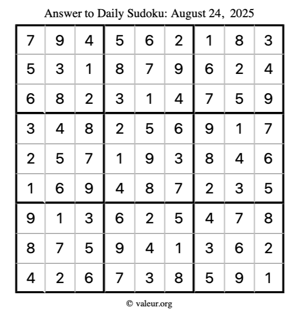 Here is the August 24, 2025 sudoku puzzle. You are welcome to print a copy to solve by hand. For your convenience, we have also included the solution further down the page so you can check your work.