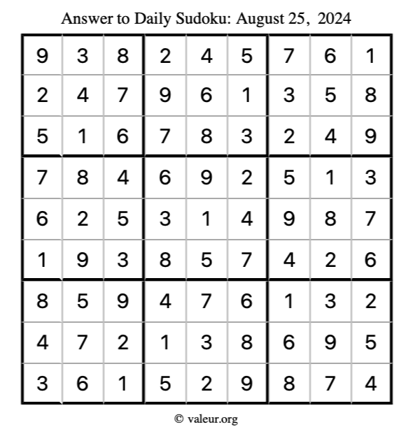 Here is the August 25, 2024 sudoku puzzle. You are welcome to print a copy to solve by hand. For your convenience, we have also included the solution further down the page so you can check your work.