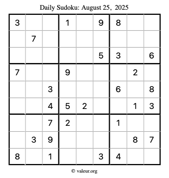 Here is the August 25, 2025 sudoku puzzle. You are welcome to print a copy to solve by hand. For your convenience, we have also included the solution further down the page so you can check your work.