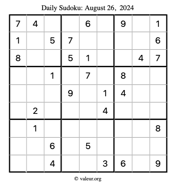Here is the August 26, 2024 sudoku puzzle. You are welcome to print a copy to solve by hand. For your convenience, we have also included the solution further down the page so you can check your work.