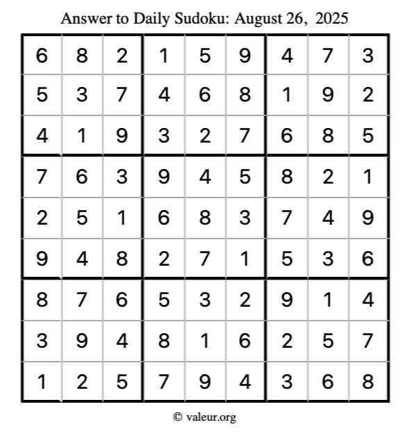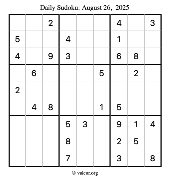 Here is the August 26, 2025 sudoku puzzle. You are welcome to print a copy to solve by hand. For your convenience, we have also included the solution further down the page so you can check your work.