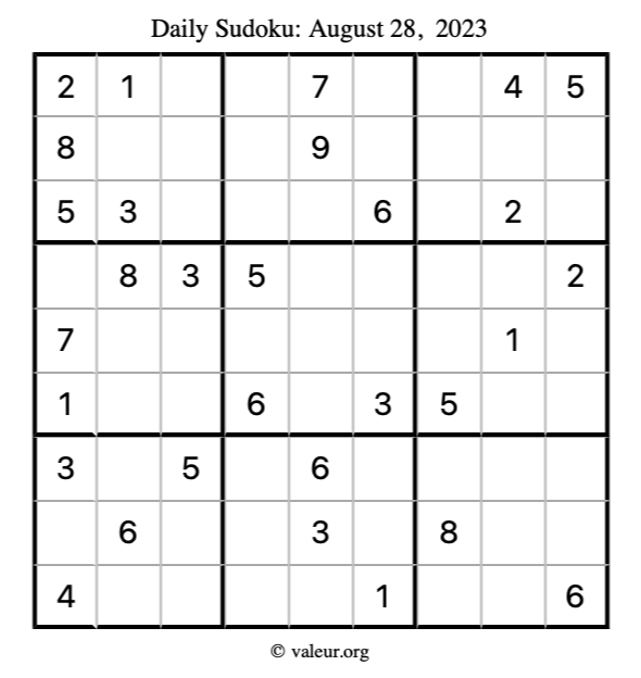 Here is the August 28, 2023 sudoku puzzle. You are welcome to print a copy to solve by hand. For your convenience, we have also included the solution further down the page so you can check your work.