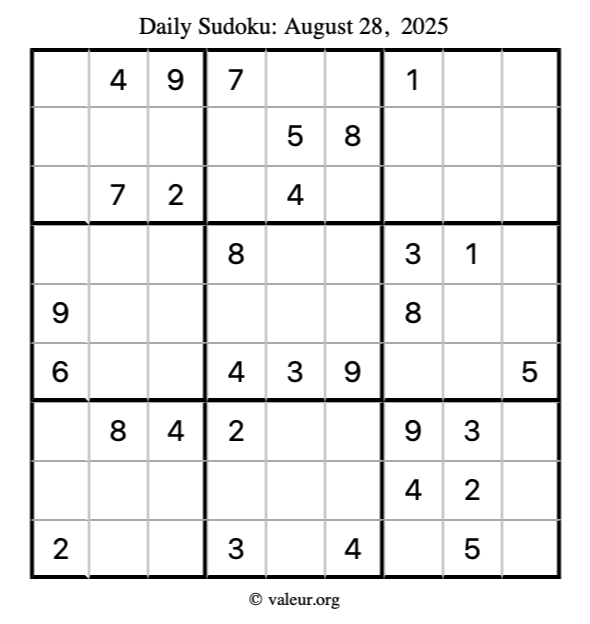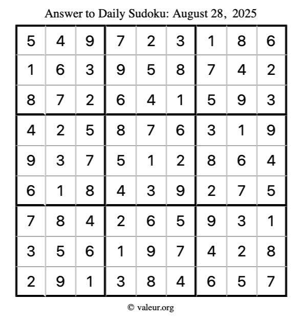Here is the August 28, 2025 sudoku puzzle. You are welcome to print a copy to solve by hand. For your convenience, we have also included the solution further down the page so you can check your work.