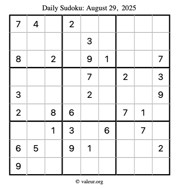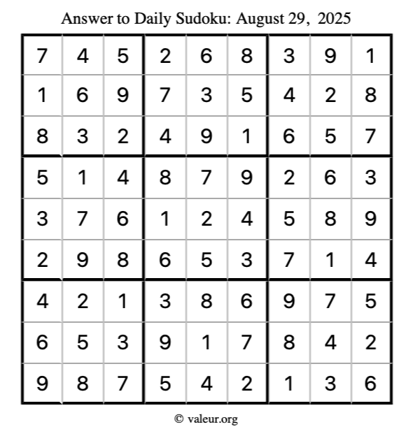 Here is the August 29, 2025 sudoku puzzle. You are welcome to print a copy to solve by hand. For your convenience, we have also included the solution further down the page so you can check your work.