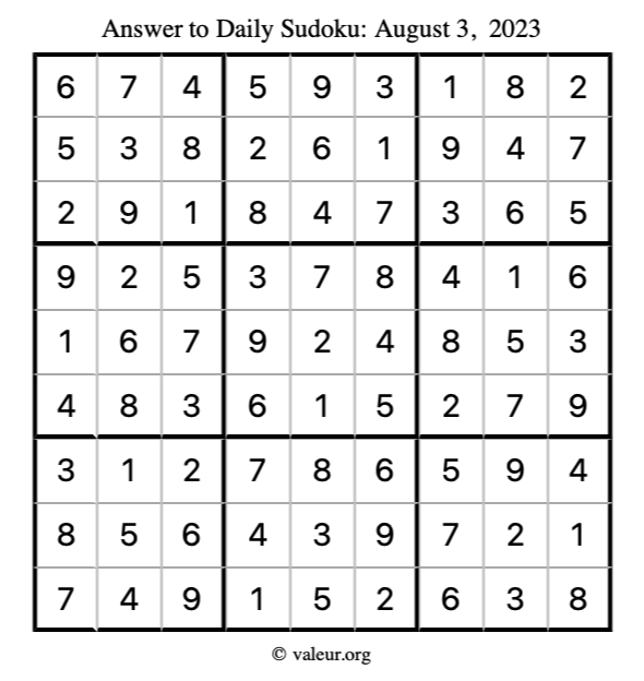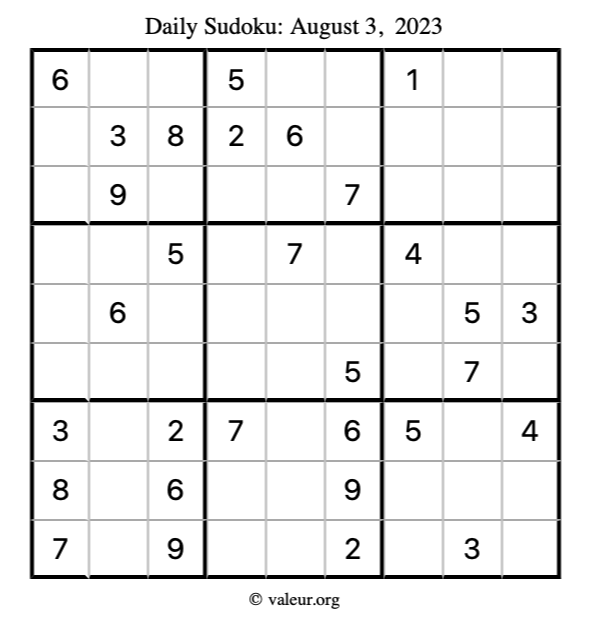 Here is the August 3, 2023 sudoku puzzle. You are welcome to print a copy to solve by hand. For your convenience, we have also included the solution further down the page so you can check your work.
