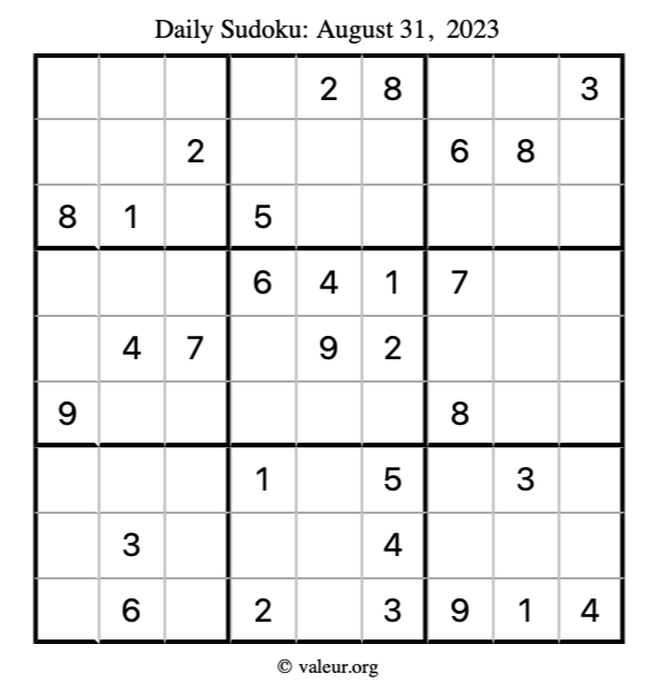 Here is the August 31, 2023 sudoku puzzle. You are welcome to print a copy to solve by hand. For your convenience, we have also included the solution further down the page so you can check your work.