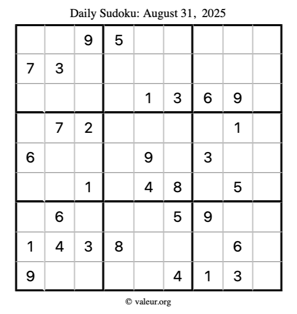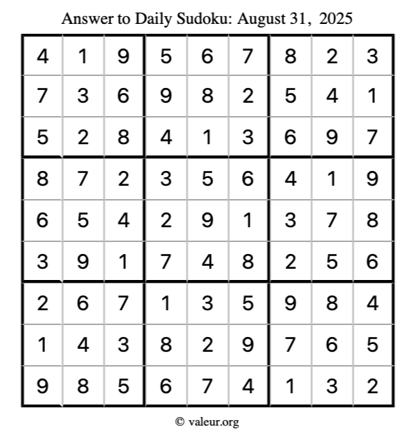Here is the August 31, 2025 sudoku puzzle. You are welcome to print a copy to solve by hand. For your convenience, we have also included the solution further down the page so you can check your work.