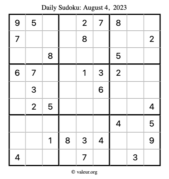 Here is the August 4, 2023 sudoku puzzle. You are welcome to print a copy to solve by hand. For your convenience, we have also included the solution further down the page so you can check your work.