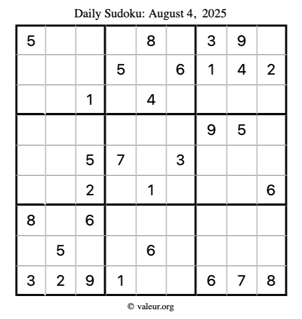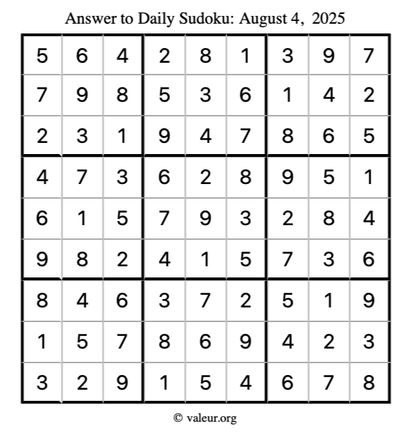 Here is the August 4, 2025 sudoku puzzle. You are welcome to print a copy to solve by hand. For your convenience, we have also included the solution further down the page so you can check your work.