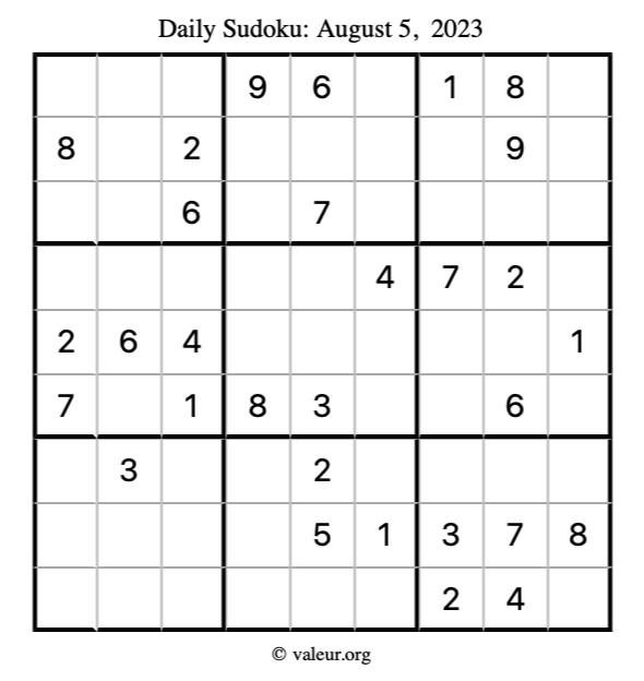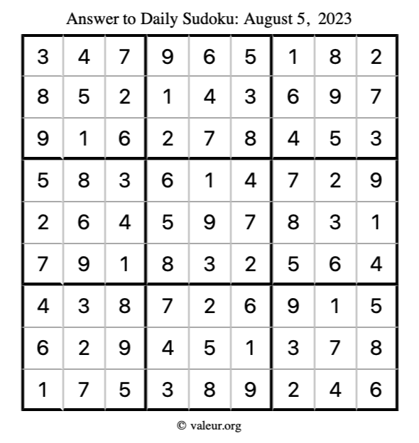 Here is the August 5, 2023 sudoku puzzle. You are welcome to print a copy to solve by hand. For your convenience, we have also included the solution further down the page so you can check your work.