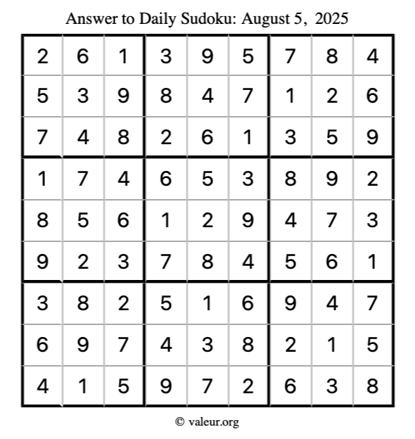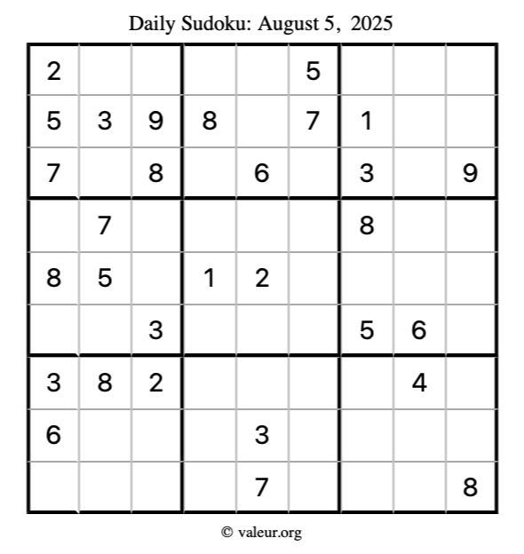 Here is the August 5, 2025 sudoku puzzle. You are welcome to print a copy to solve by hand. For your convenience, we have also included the solution further down the page so you can check your work.