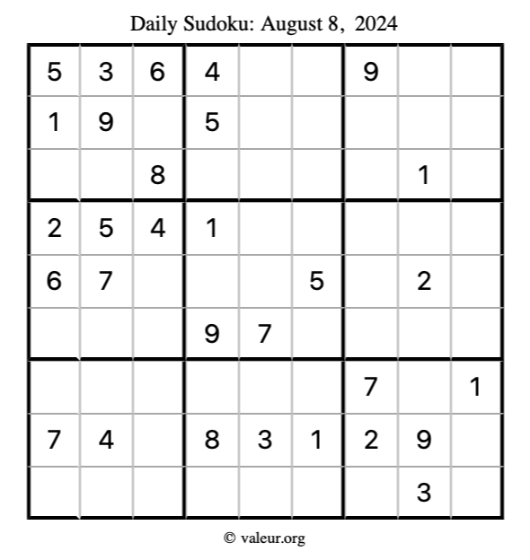 Here is the August 8, 2024 sudoku puzzle. You are welcome to print a copy to solve by hand. For your convenience, we have also included the solution further down the page so you can check your work.