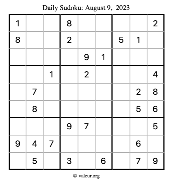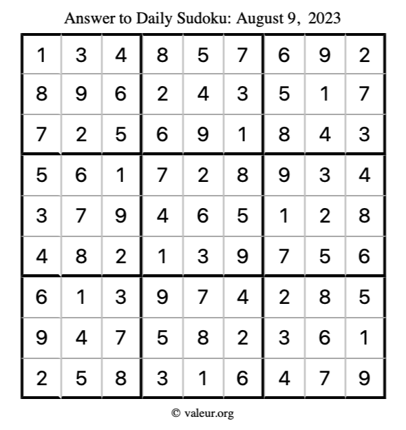 Here is the August 9, 2023 sudoku puzzle. You are welcome to print a copy to solve by hand. For your convenience, we have also included the solution further down the page so you can check your work.