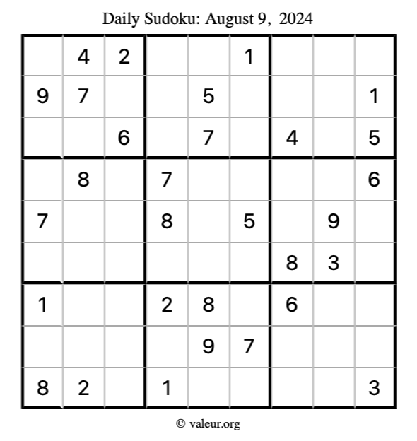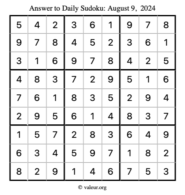 Here is the August 9, 2024 sudoku puzzle. You are welcome to print a copy to solve by hand. For your convenience, we have also included the solution further down the page so you can check your work.