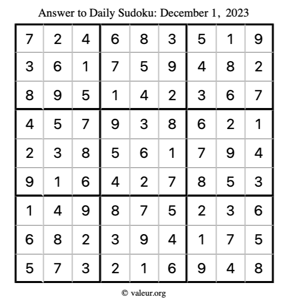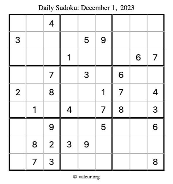 Here is the December 1, 2023 sudoku puzzle. You are welcome to print a copy to solve by hand. For your convenience, we have also included the solution further down the page so you can check your work.