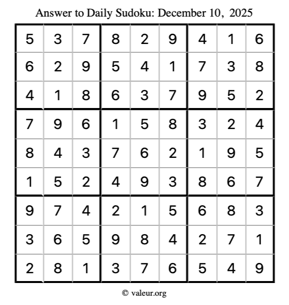 As promised, here is the solution to the December 10, 2025 sudoku puzzle: