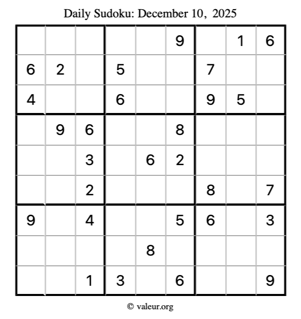 Here is the December 10, 2025 sudoku puzzle. You are welcome to print a copy to solve by hand. For your convenience, we have also included the solution further down the page so you can check your work.