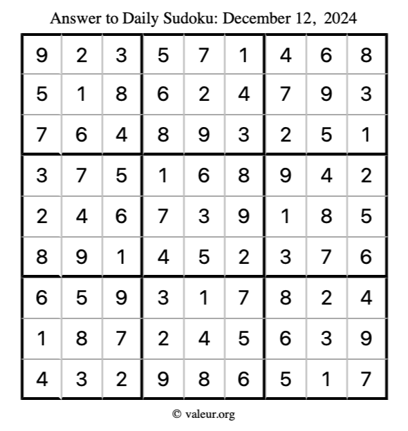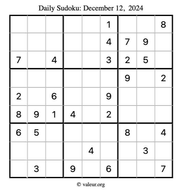 Here is the December 12, 2024 sudoku puzzle. You are welcome to print a copy to solve by hand. For your convenience, we have also included the solution further down the page so you can check your work.