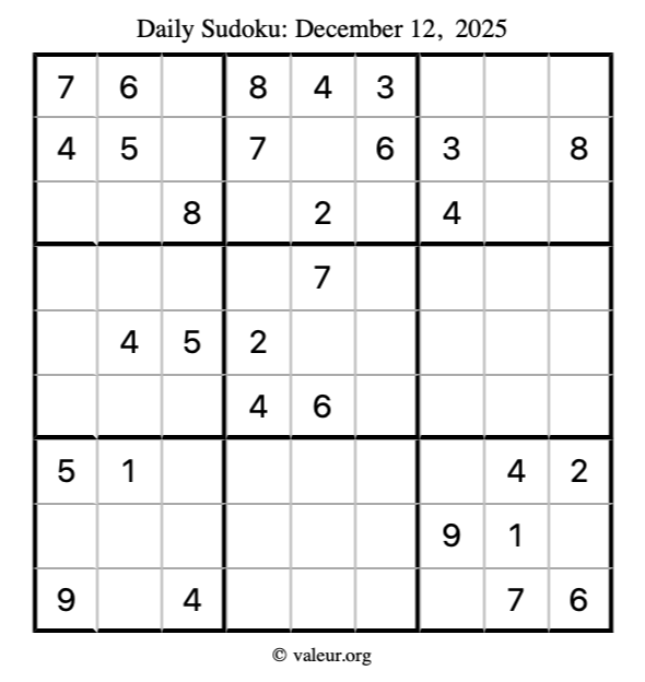 Here is the December 12, 2025 sudoku puzzle. You are welcome to print a copy to solve by hand. For your convenience, we have also included the solution further down the page so you can check your work.