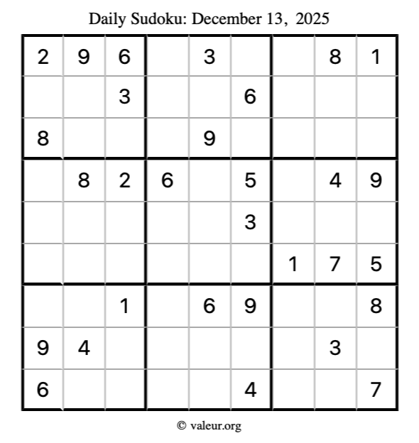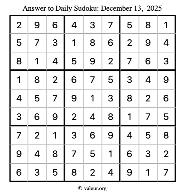 Here is the December 13, 2025 sudoku puzzle. You are welcome to print a copy to solve by hand. For your convenience, we have also included the solution further down the page so you can check your work.