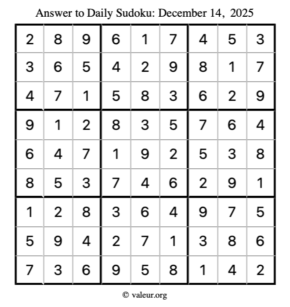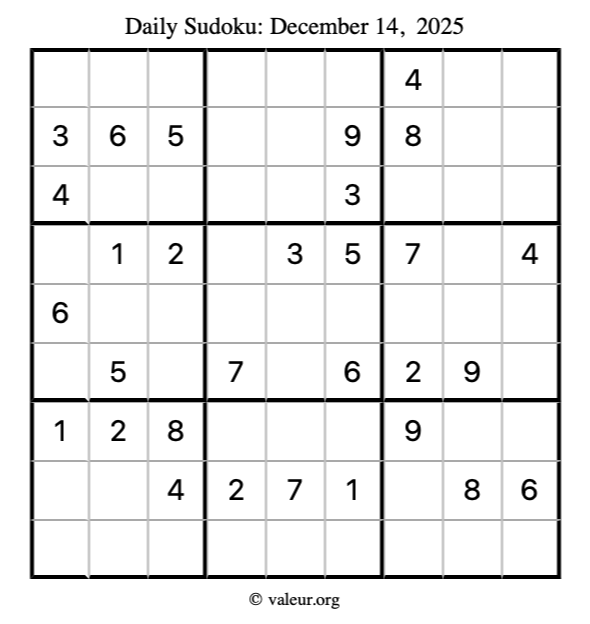 Here is the December 14, 2025 sudoku puzzle. You are welcome to print a copy to solve by hand. For your convenience, we have also included the solution further down the page so you can check your work.
