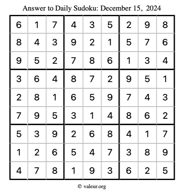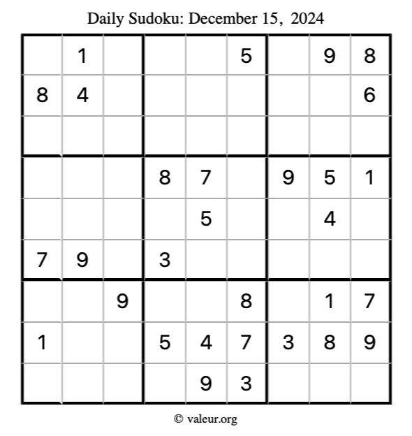 Here is the December 15, 2024 sudoku puzzle. You are welcome to print a copy to solve by hand. For your convenience, we have also included the solution further down the page so you can check your work.