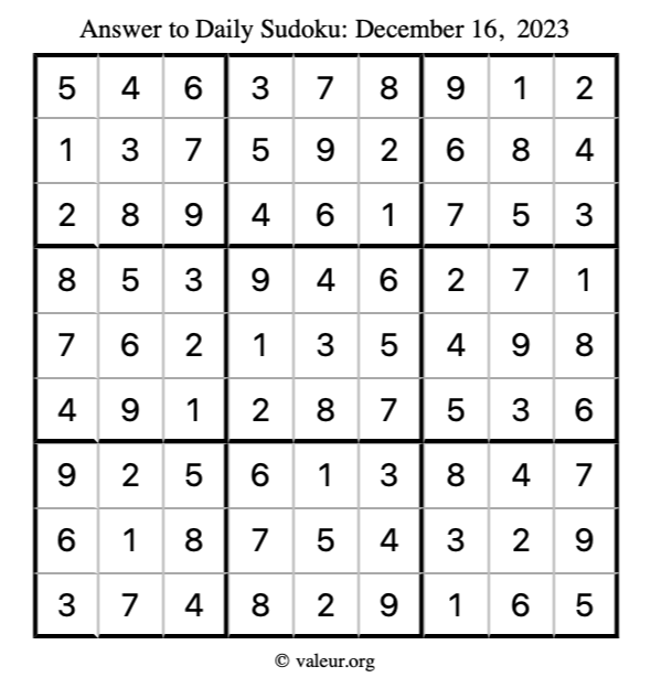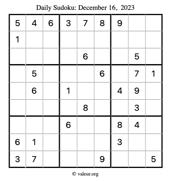 Here is the December 16, 2023 sudoku puzzle. You are welcome to print a copy to solve by hand. For your convenience, we have also included the solution further down the page so you can check your work.