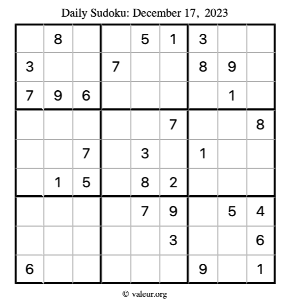 Here is the December 17, 2023 sudoku puzzle. You are welcome to print a copy to solve by hand. For your convenience, we have also included the solution further down the page so you can check your work.