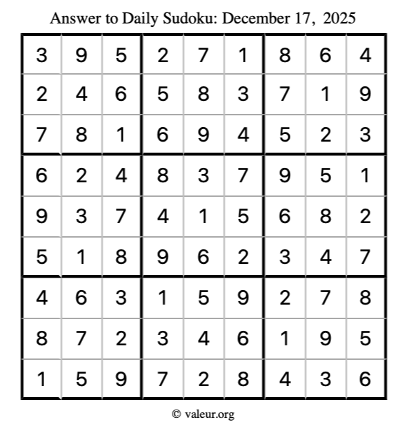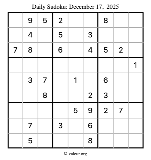 Here is the December 17, 2025 sudoku puzzle. You are welcome to print a copy to solve by hand. For your convenience, we have also included the solution further down the page so you can check your work.