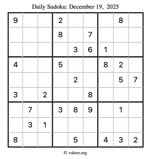 Here is the December 19, 2025 sudoku puzzle. You are welcome to print a copy to solve by hand. For your convenience, we have also included the solution further down the page so you can check your work.