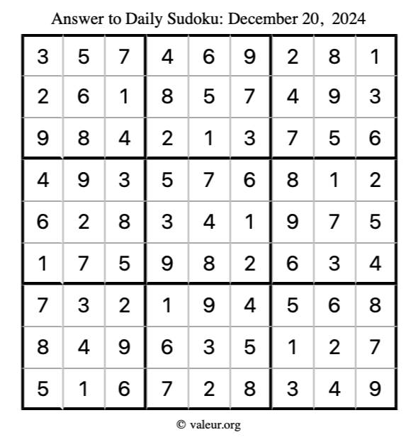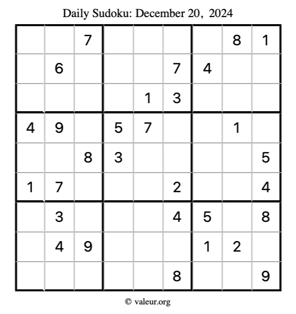 Here is the December 20, 2024 sudoku puzzle. You are welcome to print a copy to solve by hand. For your convenience, we have also included the solution further down the page so you can check your work.