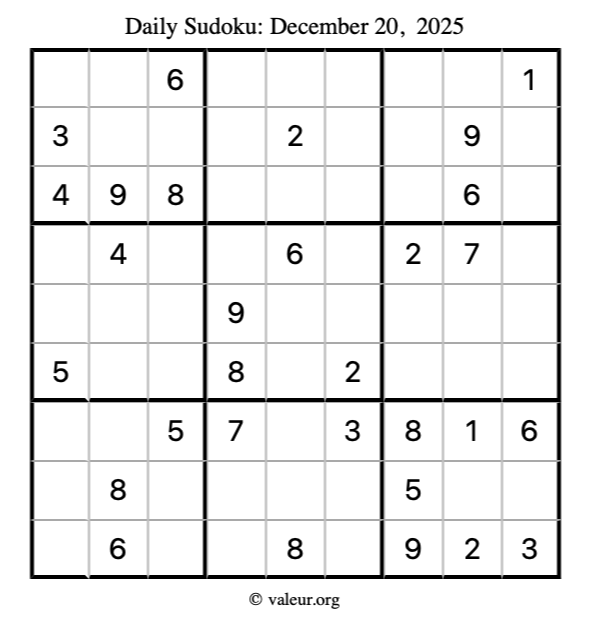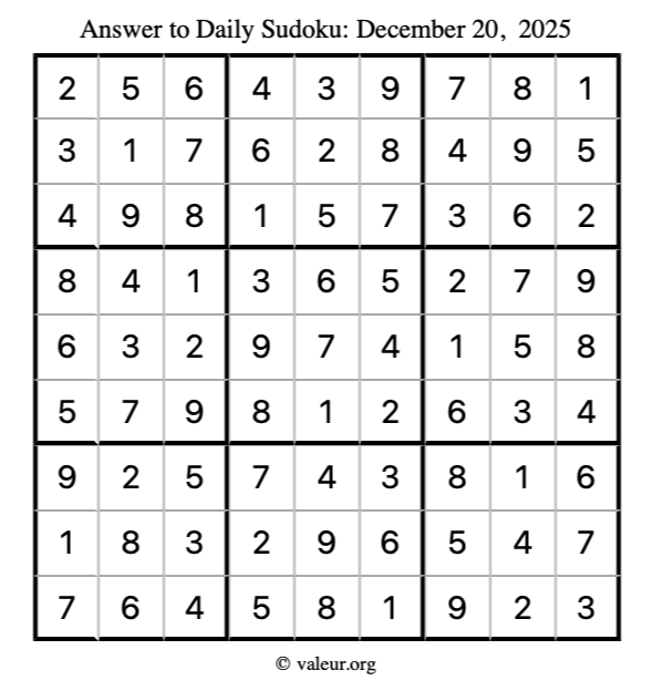 Here is the December 20, 2025 sudoku puzzle. You are welcome to print a copy to solve by hand. For your convenience, we have also included the solution further down the page so you can check your work.
