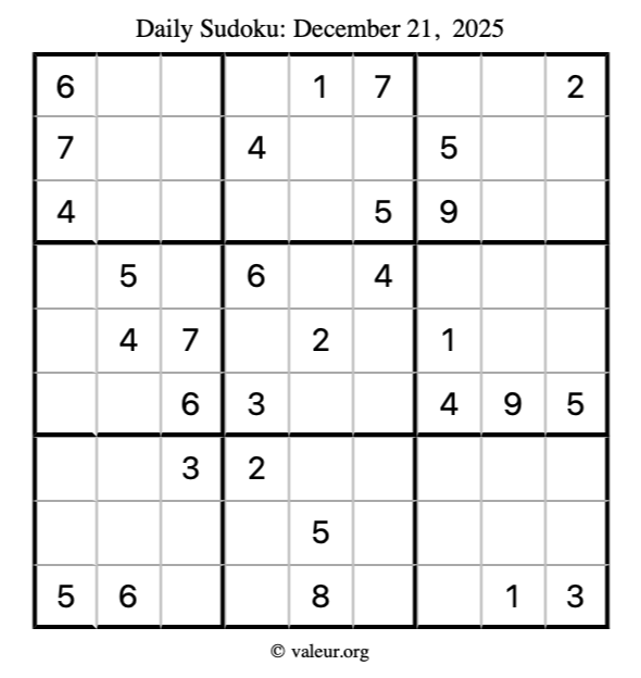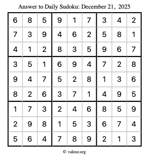 Here is the December 21, 2025 sudoku puzzle. You are welcome to print a copy to solve by hand. For your convenience, we have also included the solution further down the page so you can check your work.