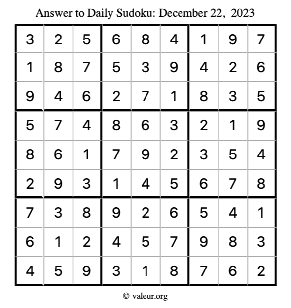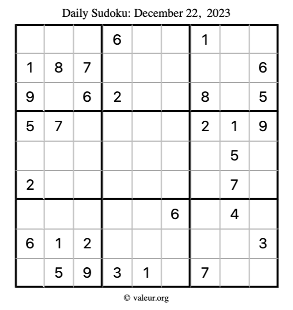 Here is the December 22, 2023 sudoku puzzle. You are welcome to print a copy to solve by hand. For your convenience, we have also included the solution further down the page so you can check your work.
