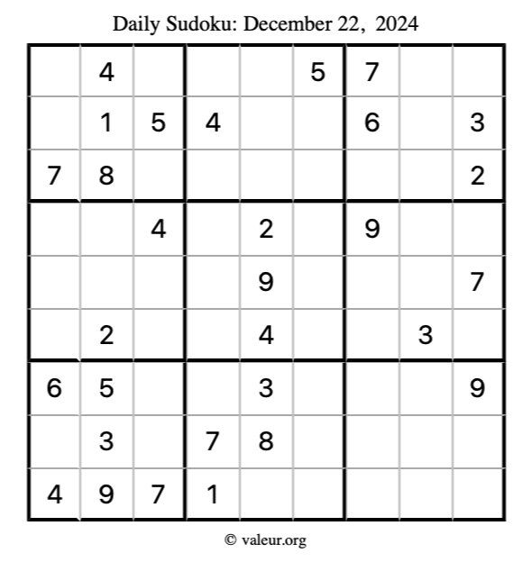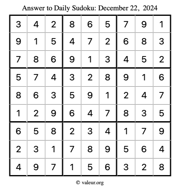 Here is the December 22, 2024 sudoku puzzle. You are welcome to print a copy to solve by hand. For your convenience, we have also included the solution further down the page so you can check your work.