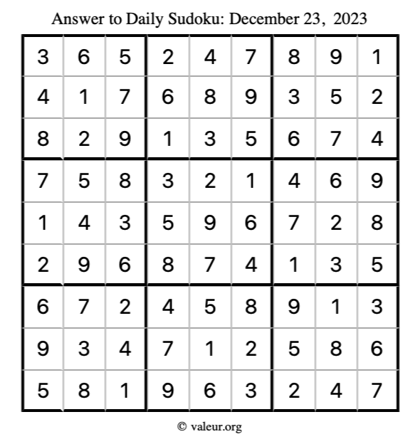 Here is the December 23, 2023 sudoku puzzle. You are welcome to print a copy to solve by hand. For your convenience, we have also included the solution further down the page so you can check your work.